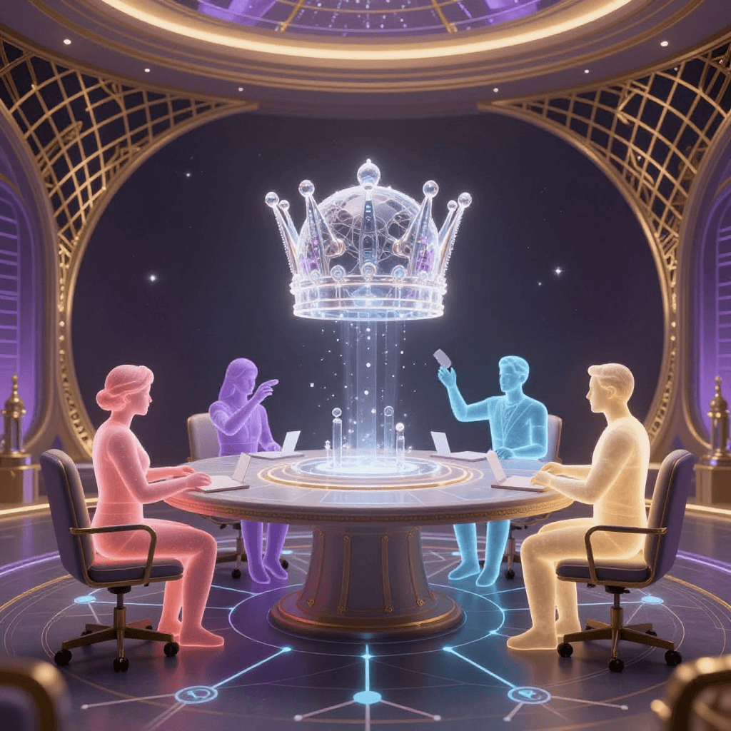 Four luminous figures convene at a round stone table in a chamber of permission lattices. Each casts a vote — translucent ballot tokens rising toward a shared crystalline Universal Profile hovering above. Governance is not coordination. It is the willingness to execute a decision your own vote opposed. 28th Moment.
